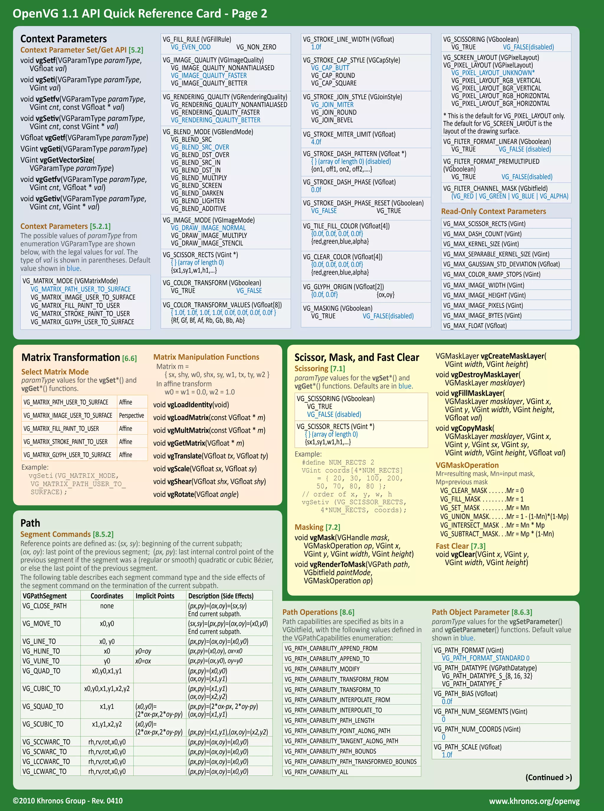 - The reference card also summarizes the context parameters that can be set and gotten in OpenVG for controlling rendering state.