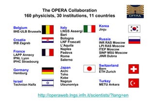 The document summarizes the OPERA neutrino velocity measurement experiment. It describes how OPERA measures the neutrino velocity by precisely measuring the baseline distance between the neutrino source and detector, and the time of flight. It also discusses past experimental results on neutrino velocity measurements and gives an overview of the design and implementation of the OPERA experiment.