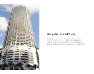 Opera Tower is a luxury condominium located in the heart of Miami's vibrant downtown, overlooking the scenic Biscayne Bay and the eight-acre Margaret Pace Park. The building features sophisticated architecture and high-end finishes, including spacious apartments with modern amenities and stunning views of the city and waterfront. With a wealth of nearby entertainment, dining options, and recreational facilities, Opera Tower offers an exceptional urban living experience in a rapidly developing area.