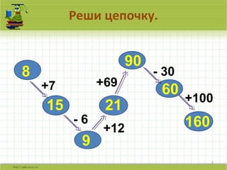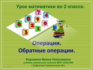 Документ представляет собой план урока математики для 2 класса, который включает в себя различные задания на выполнение математических операций и нахождение обратных операций. Учитель Ирина Николаевна Коробина использует примеры, такие как задачи на сложение и вычитание, а также разбирает последовательности чисел и закономерности. Также документ включает в себя схемы для составления и решения задач, а ссылки на используемые материалы и источники.