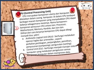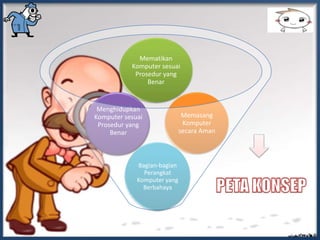 Dokumen ini menjelaskan tentang bagian-bagian penting dari komputer, yaitu monitor, kabel, keyboard, mouse, dan drive optik serta prosedur yang benar untuk menghidupkan dan mematikan komputer. Selain itu, juga dibahas risiko keselamatan yang mungkin terjadi saat menggunakan komputer dan langkah-langkah untuk mengurangi risiko. Pengoperasian dan penggunaan perangkat keras komputer dijelaskan secara rinci, termasuk prosedur untuk memastikan keamanan data.