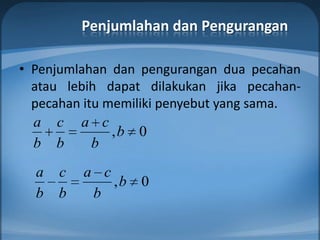 Dokumen ini membahas operasi pada pecahan termasuk penjumlahan, pengurangan, perkalian, pembagian, pemangkatan, dan bentuk baku pecahan. Operasi dasar pecahan dapat dilakukan jika memiliki penyebut yang sama. Hasil perkalian diperoleh dengan mengalikan pembilang dan penyebut masing-masing. Pecahan harus dinyatakan sebagai biasa apabila terdapat campuran.