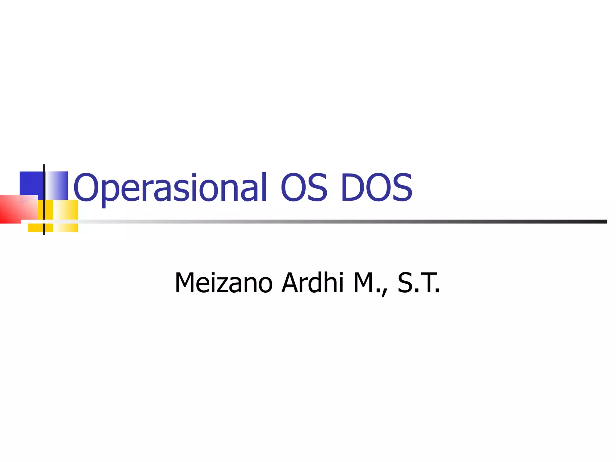 Dokumen tersebut menjelaskan tentang operasional sistem operasi DOS, meliputi tahapan menjalankan DOS Prompt, kondisi dasar, dan penjelasan singkat tentang perintah-perintah dasar DOS seperti ATTRIB, DIR, CD, MD, RM, REN, COPY, DEL, MOVE, serta penggunaan HELP dan pembatalan proses menggunakan CTRL+C.
