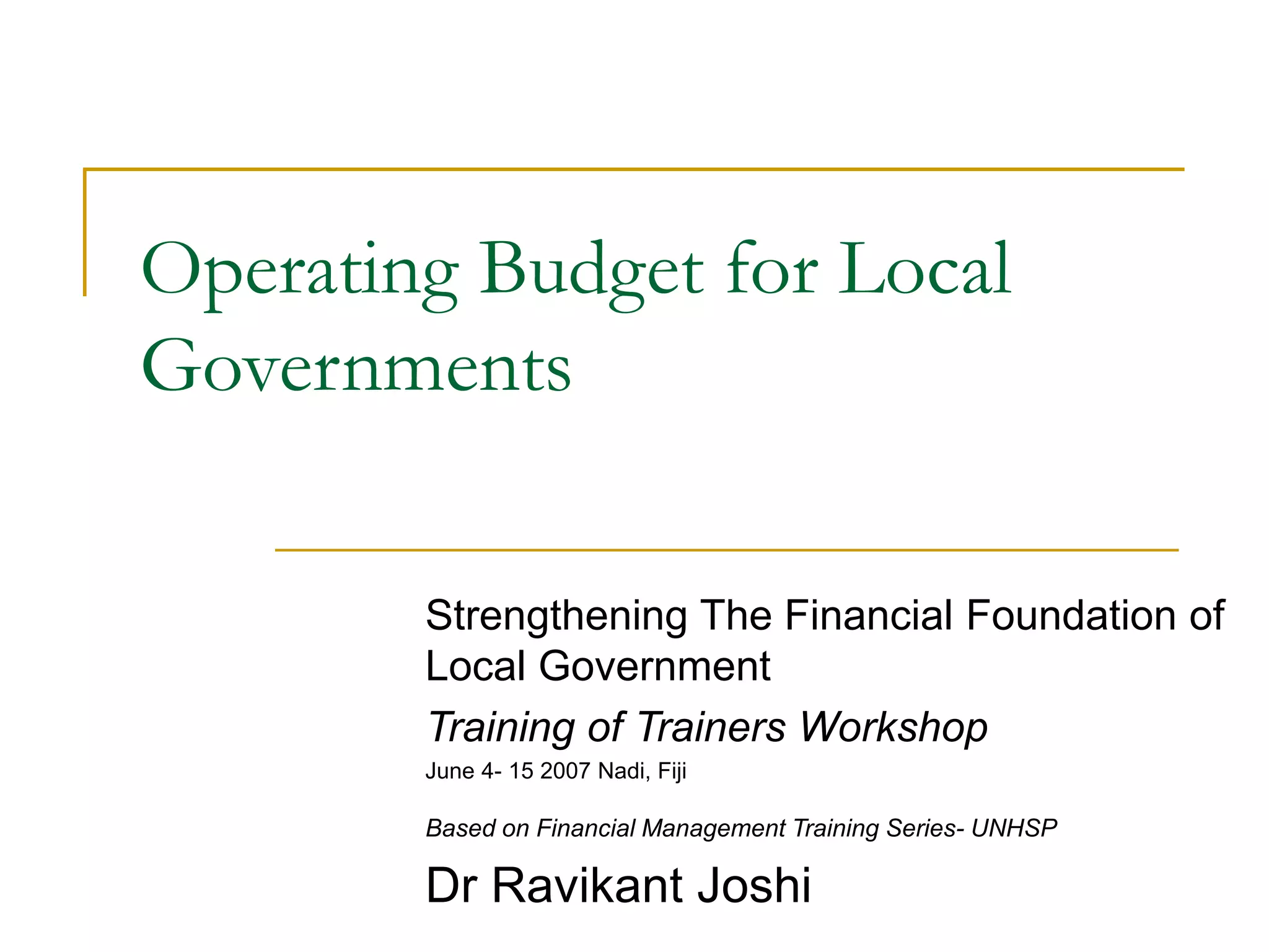 The document provides an overview of operating budget concepts and processes for local governments. It discusses key relationships between operating budgets and other financial planning aspects such as capital investment plans, strategic planning, accounting, and more. The document also examines characteristics of effective operating budget systems and the roles and responsibilities of various actors such as citizens, governing bodies, department heads, and chief executive officers in the budget preparation and implementation process.