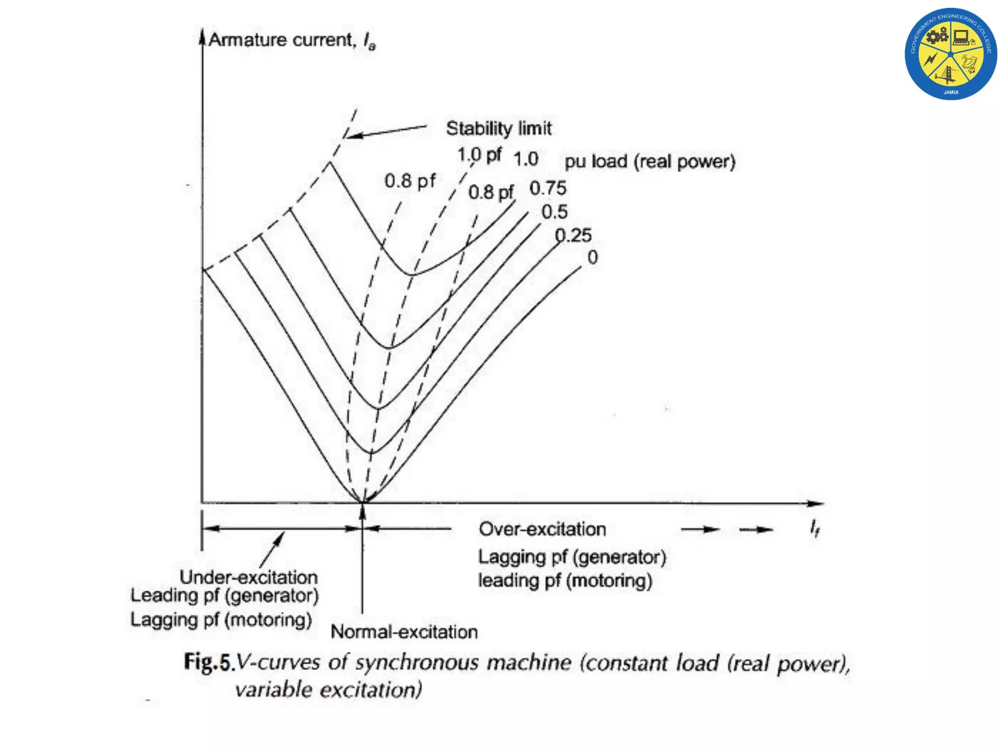 This document discusses the operating characteristics of synchronous machines under conditions of variable load and excitation. It examines the power-angle characteristic and phasor diagrams of synchronous machines in generating and motoring modes. The machine behavior is analyzed at constant load with variable excitation, showing that the power angle varies to keep real power constant as excitation changes. Minimum excitation is defined as the stability limit where the power angle reaches 90 degrees. In summary, real power depends on mechanical input while excitation controls only power factor in a synchronous machine.