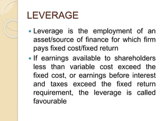 This document discusses different types of leverage used in business - operating, financial, and combined leverage. Operating leverage is related to fixed operating costs and how they magnify changes in sales on earnings. Financial leverage uses fixed financing costs to magnify the effect on earnings per share. Combined leverage is the product of operating and financial leverage. Degrees of leverage are defined to quantify the effects. Indifference points are discussed as the earnings level where leveraged vs unleveraged financing plans yield equal shareholder returns. Analysis of earnings-per-share for different financing options is based on expected earnings levels relative to the indifference point.