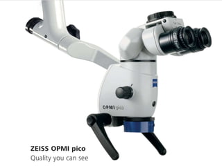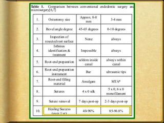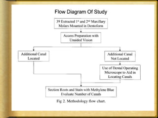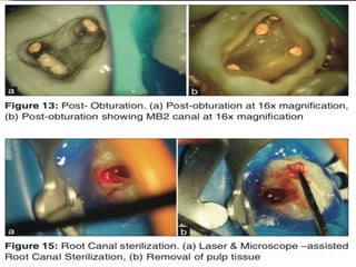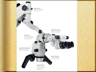 The document discusses the importance of using operating microscopes (OM) in endodontics for improved visual clarity, detailing their design, magnification capabilities, and ergonomic considerations. It also covers clinical applications, advantages, disadvantages, and the impact of OMs on treatment outcomes, highlighting their necessity for successful endodontic procedures. The study illustrates that using a dental operating microscope significantly enhances both the efficiency of procedures and the quality of patient care.