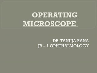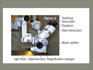 The document provides an extensive overview of operating microscopes used in ophthalmic surgery, detailing their components, such as observation, illumination, and mechanical support systems. It highlights the evolution and significance of such microscopes, including various magnification systems, the importance of illumination types, and specific models like the OMS 710 and OMS 800. Additionally, it includes care instructions to maintain the equipment's longevity and functionality.