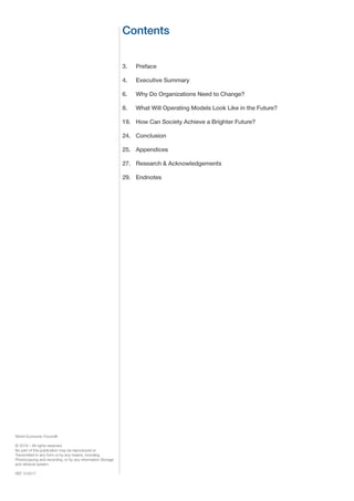 The World Economic Forum's report discusses the transformation of operating models in response to the fourth industrial revolution, emphasizing the need for businesses to adapt to digital disruption by embracing innovative structures and collaboration. It identifies seven transformative characteristics essential for future business models and highlights the implications for workforce dynamics and societal challenges. Ultimately, the report calls for collective efforts to ensure an inclusive and prosperous future for both businesses and society amid rapid changes.