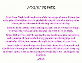 The document is a prayer for nurses asking Jesus for guidance and strength in their nursing duties. It asks Jesus to help the nurse be faithful in their calling as Jesus left the care of the sick to nurses. It asks for a gentle voice, soft hands, and presence that brings hope and consolation as Jesus did for the sick. It acknowledges the nurse is weak and needs Jesus' aid to do what he wants them to be - an angel of the sickroom.