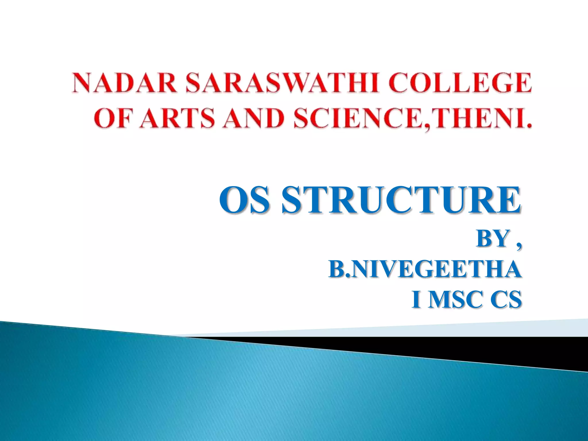 This document outlines the key components and structure of an operating system. It discusses that OSes are composed of processes, memory management, file management, I/O management, and virtual machines. Each component plays an important role, with processes encapsulating running programs and the OS responsible for scheduling, memory allocation, file input/output, and virtualizing hardware resources. The structure of an OS, while varied between implementations, generally includes these core components.