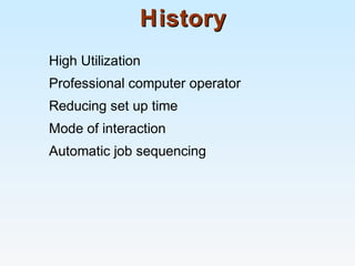 This document provides an introduction and overview of operating systems. It defines an operating system as a program that acts as an intermediary between the user and computer hardware to effectively utilize system resources and make problem solving easier. A computer system consists of hardware, operating system, application programs, and users. The operating system coordinates access to resources, executes programs, handles input/output, manages files and directories, and provides protection and security for multi-user systems. It discusses the evolution of operating systems and provides examples of early systems like batch processing and timesharing systems.