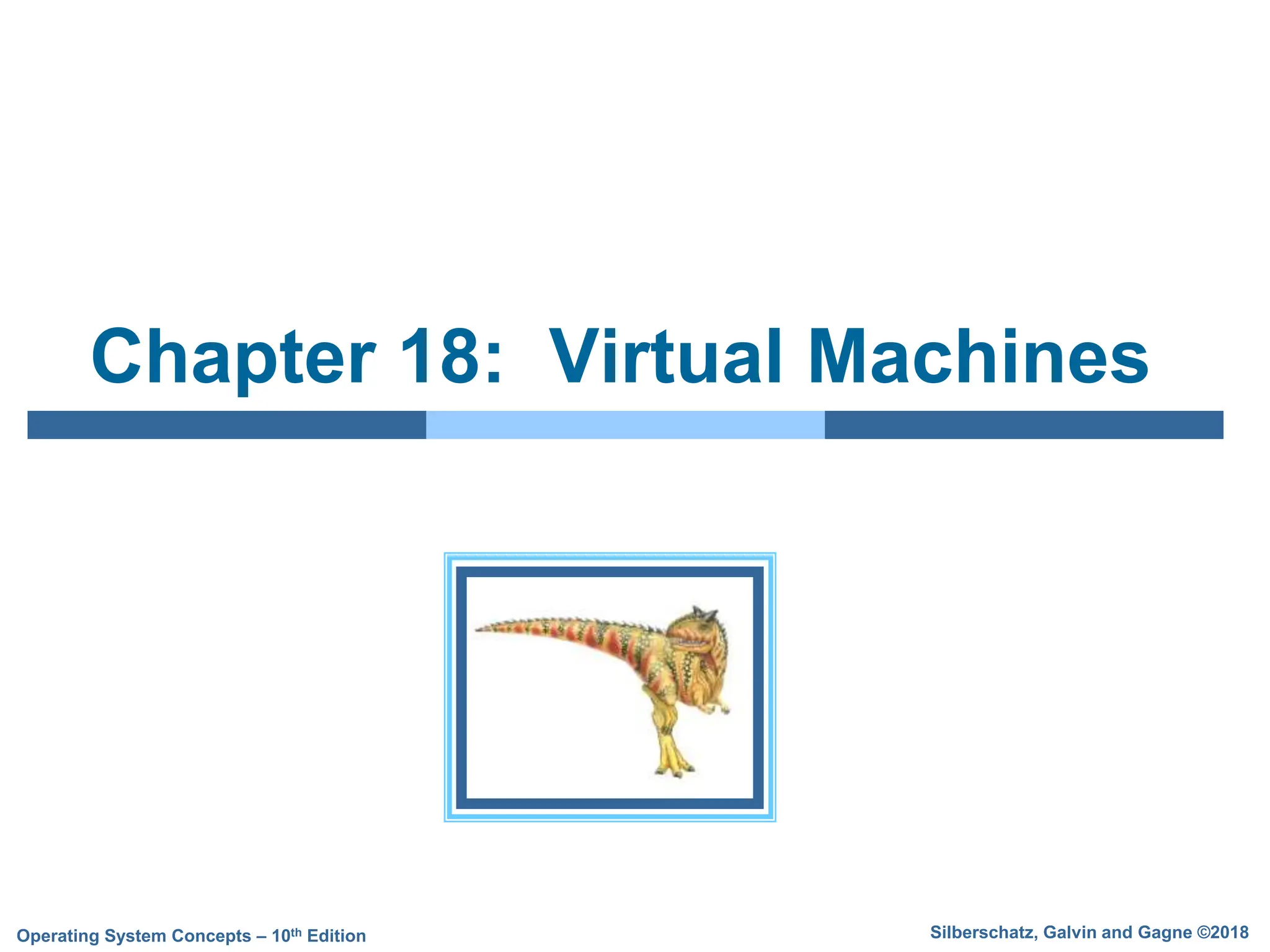 Chapter 18 of 'Operating System Concepts' discusses virtual machines (VMs), covering their history, benefits, and various implementations. It explains different types of hypervisors, including type 0, type 1, and type 2, along with virtualization techniques such as paravirtualization and binary translation. The chapter highlights the increasing hardware support for virtualization and its significance in modern computing environments.