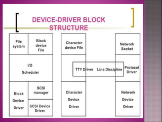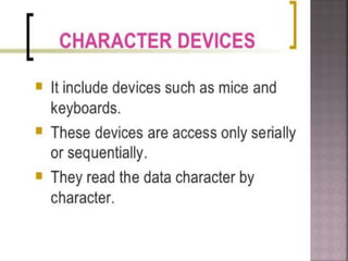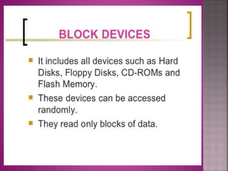 The document provides an overview of the Linux file system, describing its role in data management and storage organization within the Linux operating system. It discusses various types of Linux file systems such as ext, JFS, ReiserFS, XFS, Btrfs, and swap file systems, highlighting their features and uses. Additionally, the document covers the input and output mechanisms in Linux, including device classification and caching methods.