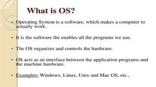 An operating system is a program that facilitates communication between users and computers while executing application programs. Key functions include process management, memory management, and input/output management, essential for resource allocation and device handling. Process management oversees the creation and termination of processes, while memory management allocates memory and input/output management coordinates hardware interactions.