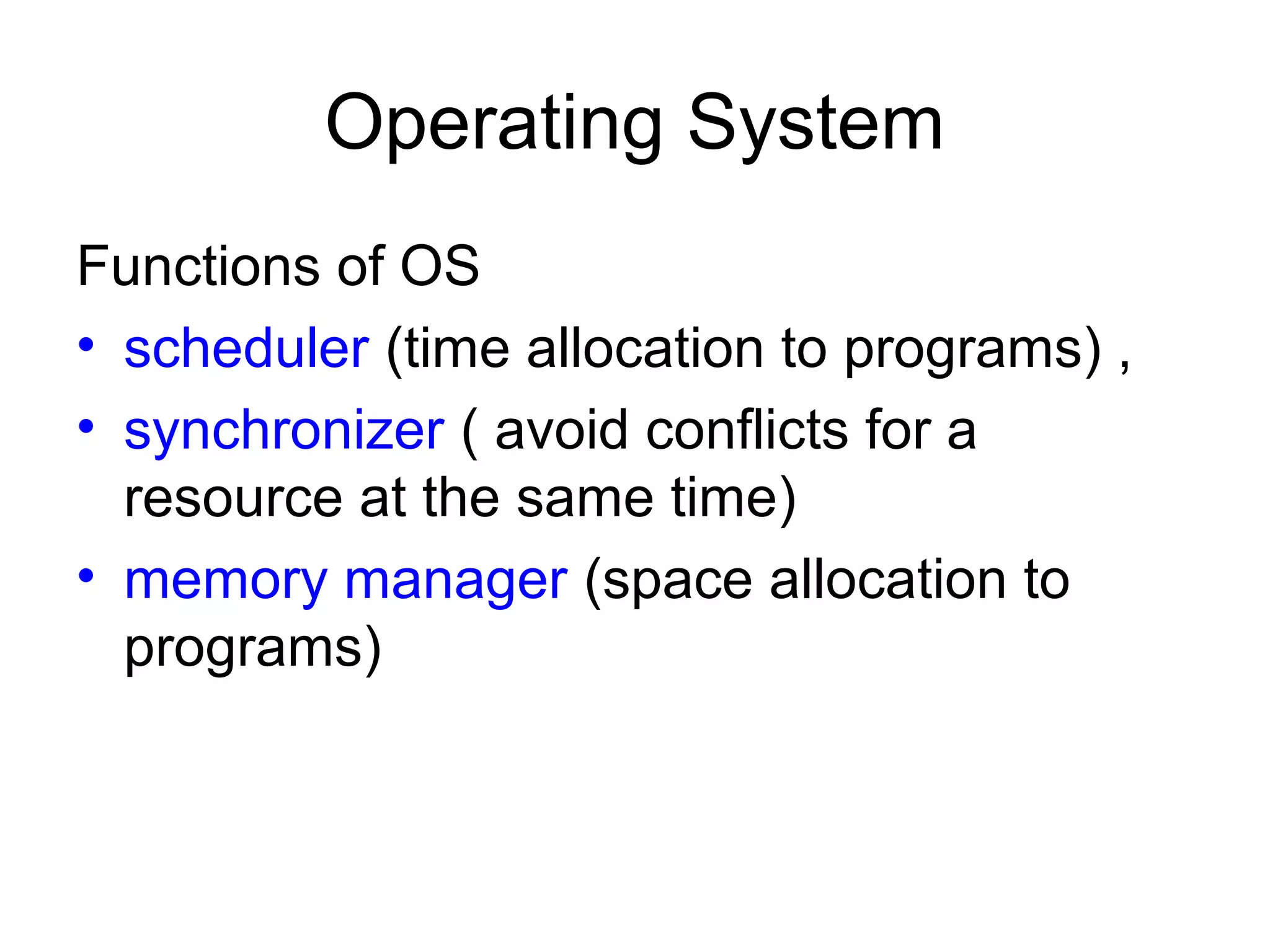 The operating system performs key functions like scheduling, synchronization, and memory management. Scheduling involves allocating time to programs and switching between threads. Synchronization ensures mutual exclusion so only one process accesses shared resources at a time using techniques like semaphores. Memory management uses virtual memory to allow processes to access more memory than physically available by swapping pages between disk and RAM.
