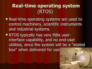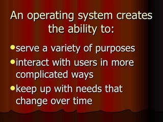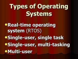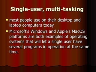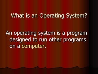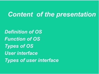 The presentation defined operating systems and discussed their types and user interfaces. It explained that an operating system manages the computer and allows users to interact with it through a user interface. There are two main types of user interfaces: graphical user interfaces (GUI) like Windows and Mac OS which use icons and windows, and command line interfaces (CLI) which are text-based and require users to type commands. The presentation also covered single-user single-task and multi-user multi-task operating systems.