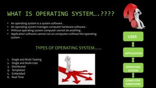 An operating system manages computer hardware and software resources and allows applications to run. It performs basic functions like managing devices, files, memory, and providing an interface for other programs. Common operating systems include Ubuntu, Android, Windows, and Mac OS. Android has the largest market share in smartphones. Operating systems have evolved from early batch systems to today's multi-tasking, distributed, and real-time systems. An operating system is essential software that enables a computer to function and run other programs.