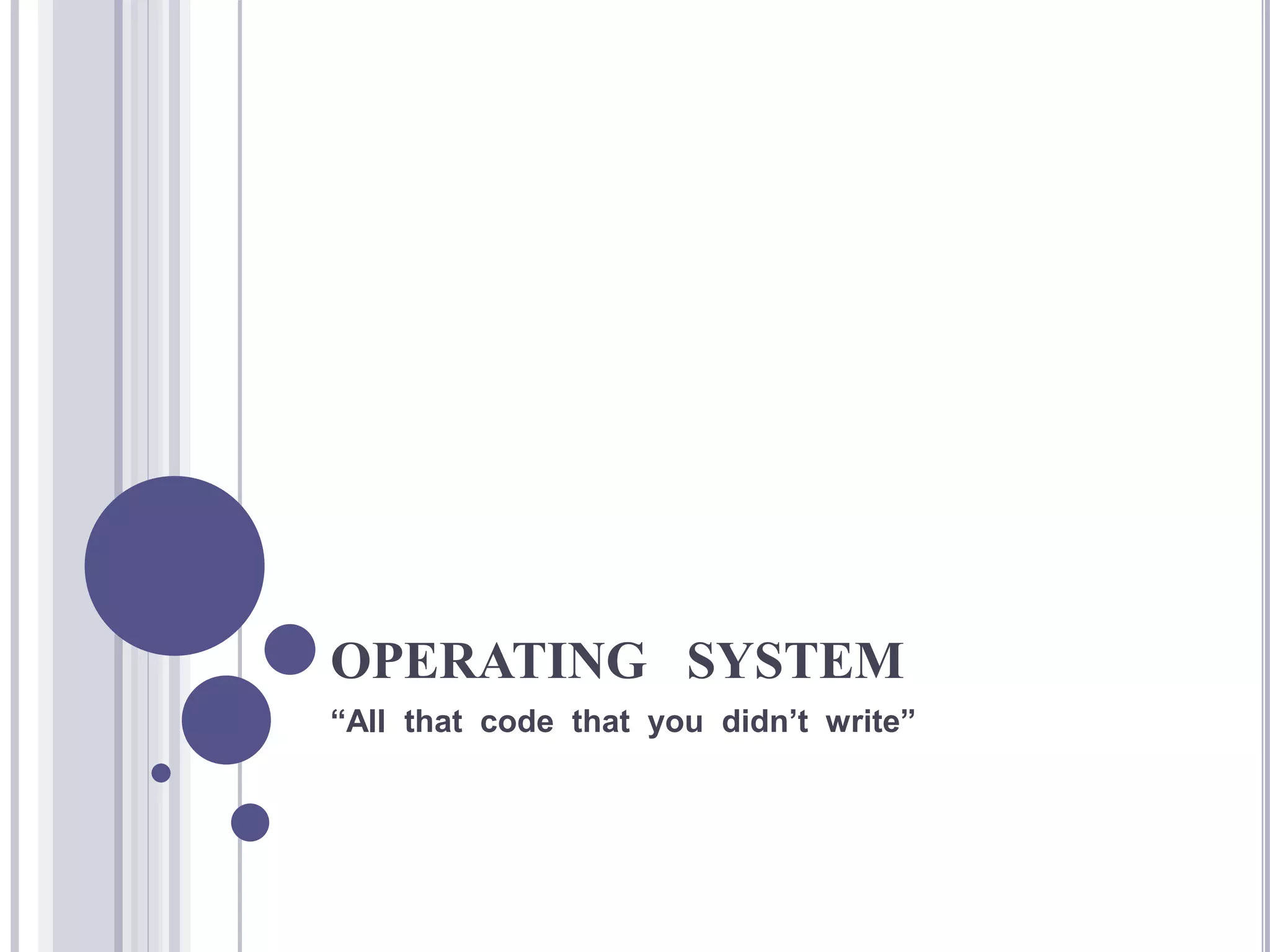 An operating system manages computer hardware and software resources and provides common services for programs. It has four main parts: the kernel, device drivers, user interface, and system utilities. The operating system manages resources like the CPU, memory, I/O devices, and security and networking. Common operating systems include batch, time-sharing, distributed, network, and real-time systems. It performs processes management, memory management, input/output management, security management, and networking management.