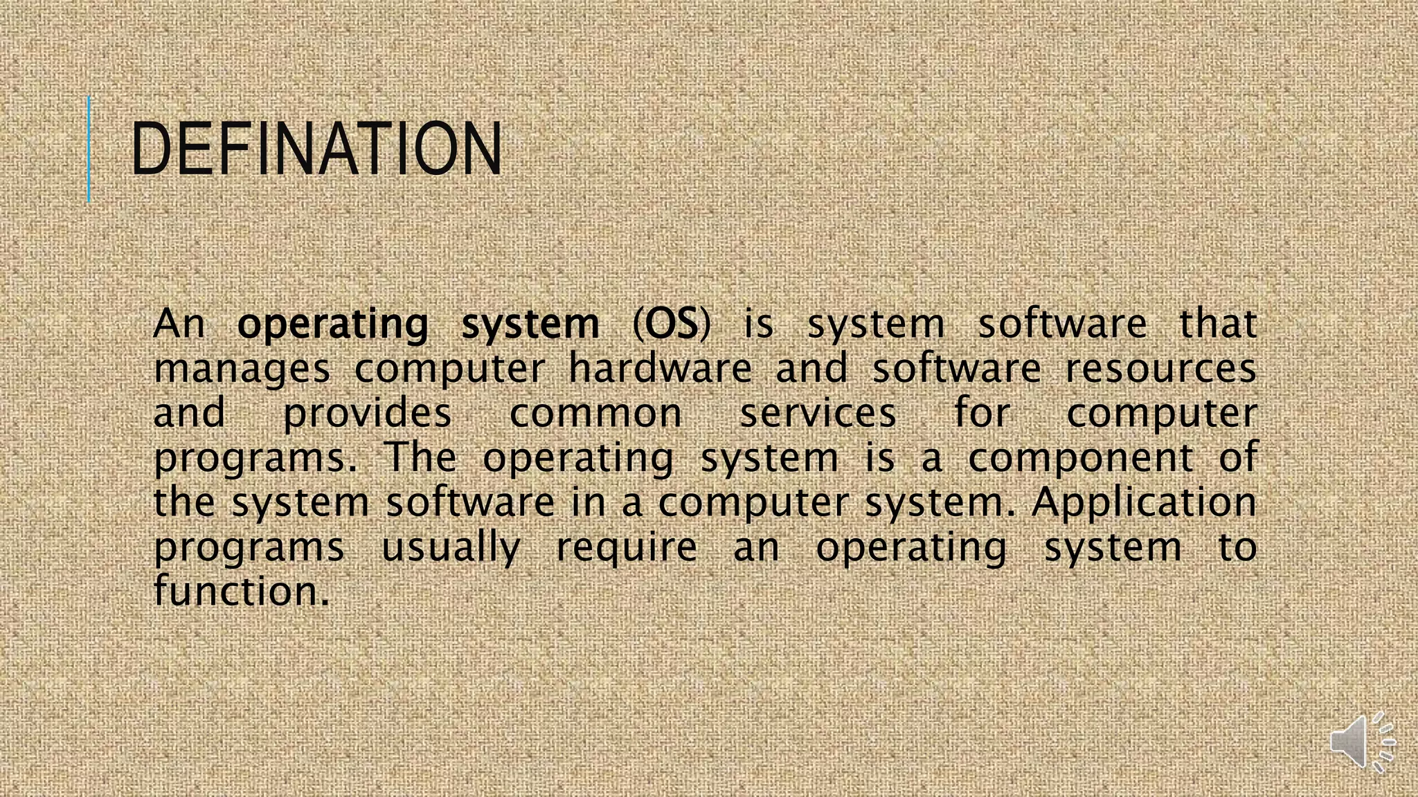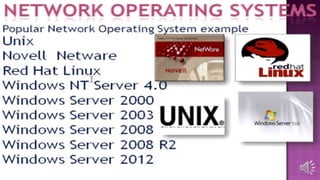 The document defines and describes various types of operating systems. It begins by defining an operating system and its basic functions such as managing hardware/software resources, providing interfaces between users and computers, and allowing applications to run. It then describes types of operating systems including single-tasking, batch, multitasking, time-sharing, real-time, distributed, and networking operating systems. For each type, it provides an example and brief explanation of its characteristics.