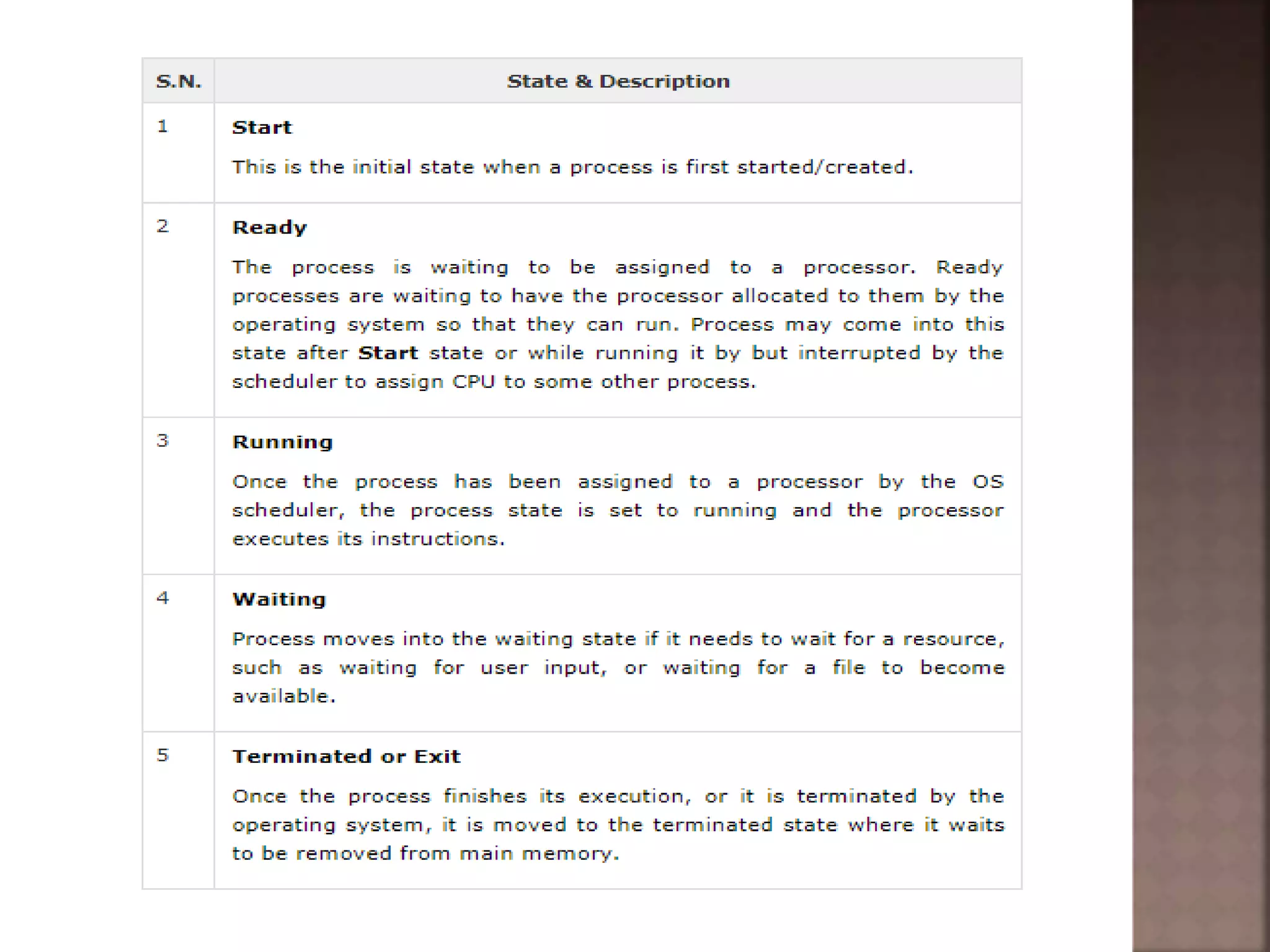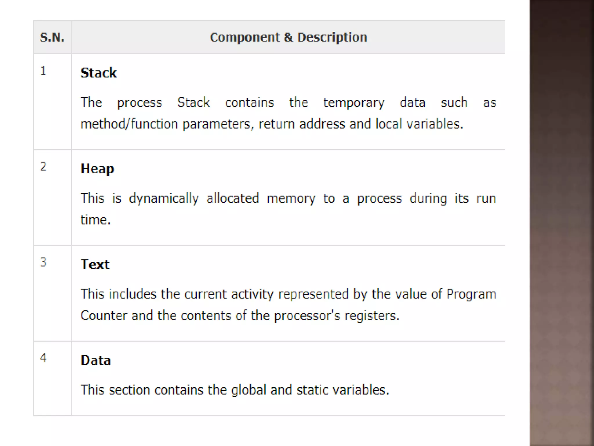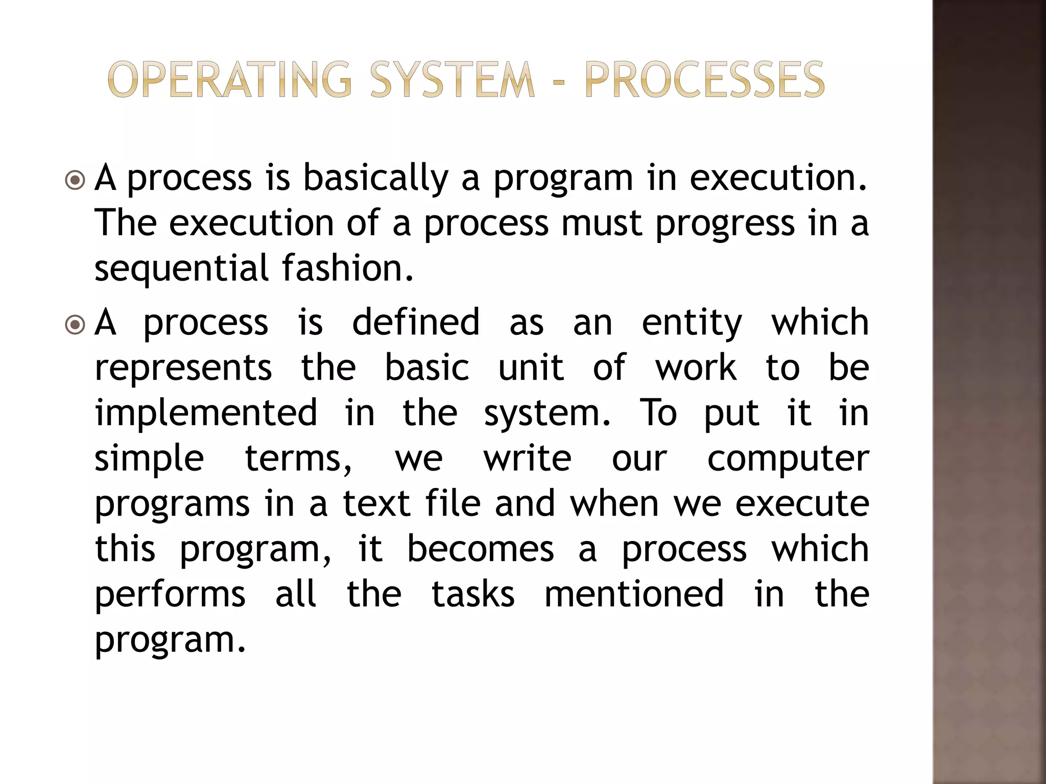 A process represents a program in execution and consists of four sections - stack, heap, text, and data. It progresses sequentially and is the basic unit of work in a system. When a program is loaded into memory, it becomes a process. A process control block (PCB) tracks process information like state, memory allocation, and other resources through a process's lifetime. The PCB contains data like process ID, program counter, CPU registers, and more. A process can be in different states like ready, running, waiting, terminated during its execution cycle.