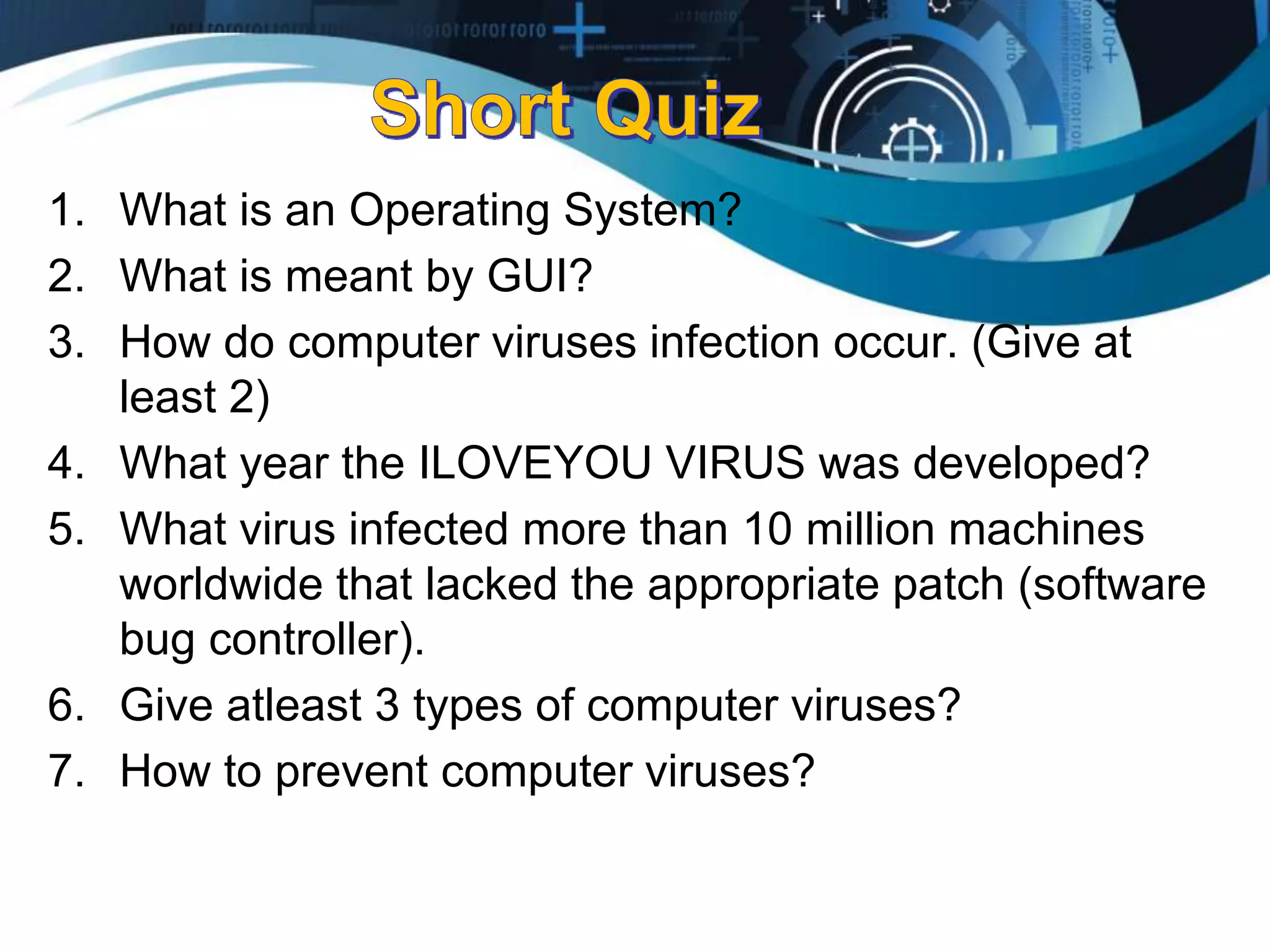 This document discusses computer viruses and operating systems. It begins by defining an operating system as an interface between the user and computer hardware that manages tasks like file handling and device control. A GUI is described as a graphics-based user interface using elements like windows and icons. Computer viruses can spread via flash drives, email attachments, and internet downloads. Some notable viruses mentioned include ILOVEYOU from 2000, Blaster worm of 2003, and MyDoom of 2004. Types of viruses include boot sector, direct action, and resident viruses. The document concludes by recommending antivirus software and caution when downloading files to prevent virus infections.