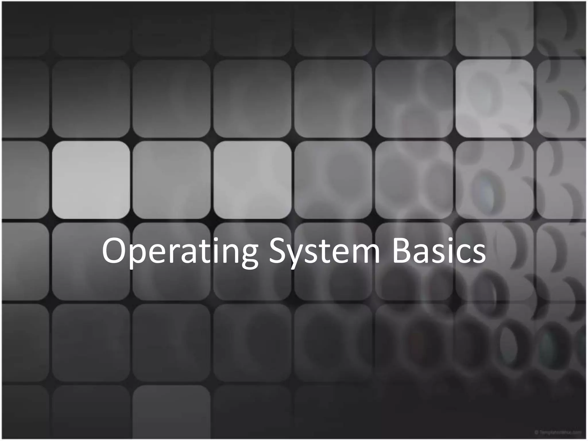 The document provides an overview of operating system basics, including what an operating system is, examples of common operating systems, their key characteristics and capabilities. It discusses how operating systems work, manage hardware/software resources, and provide services to computer programs. Specific operating systems covered include Windows, Mac OS X, Linux, and mobile operating systems like iOS and Android. [/SUMMARY]