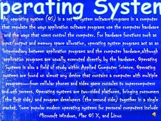 The document provides information about operating systems including their definition, common features, and examples. It defines an operating system as software that manages hardware resources and allows other programs to execute. Common features described are process management, memory management, interrupts, and graphical user interfaces. Examples of operating systems discussed include Windows 98, Windows XP, Windows Vista, Windows 7, and Linux.