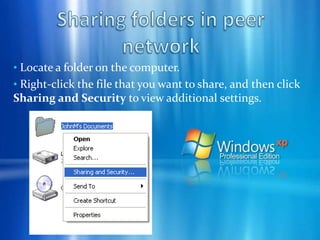 The document provides a comprehensive guide on installing Windows XP, including hardware requirements, a pre-installation checklist, and a detailed installation process. Additionally, it covers peer-to-peer networking concepts, highlighting how computers can share resources directly without a central server, along with the necessary setup for creating such a network in Windows XP. It also explains the advantages of peer-to-peer networking, including efficient collaboration, real-time communications, and resource distribution.