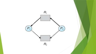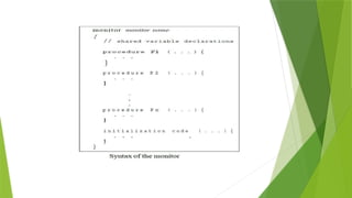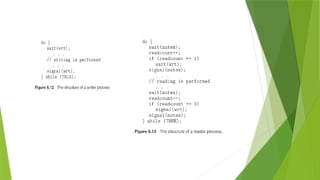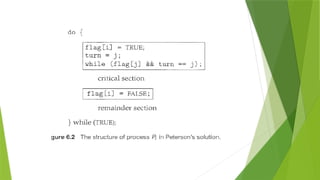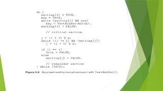 The document discusses the concept of race conditions in process synchronization, using examples such as a bank account shared by two processes and the critical section problem. It highlights the need for synchronization mechanisms to prevent incorrect outcomes when multiple processes access shared resources. It also introduces various synchronization tools like semaphores, locks, and monitors, and describes classical synchronization problems including deadlocks and starvation.