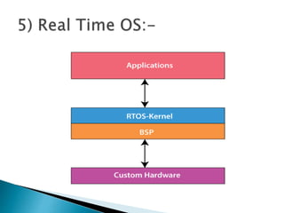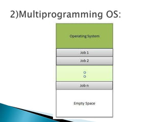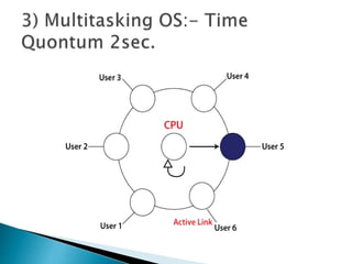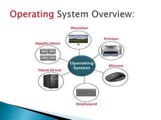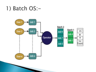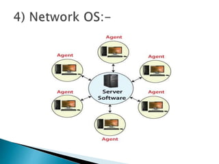 The document outlines the role of an operating system as an intermediary between the user and hardware, detailing its functions such as resource management and security. It also categorizes different types of operating systems, including batch, multiprogramming, and real-time systems. Additionally, it introduces the concept of computer networks, describing various types of networks and devices used for communication.