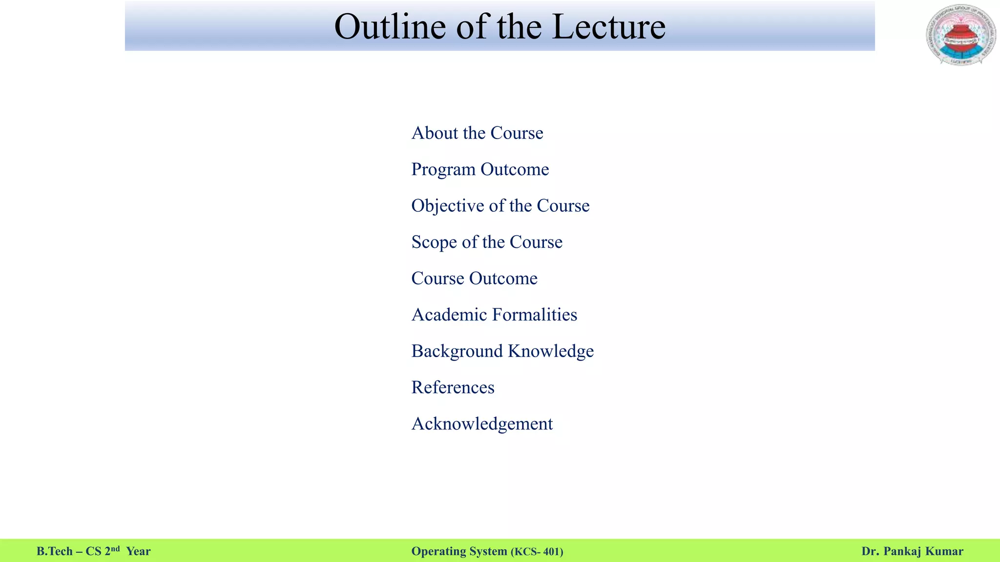 The document outlines a B.Tech course on Operating Systems (KCS-401) by Dr. Pankaj Kumar, which covers essential topics such as CPU scheduling, memory management, and I/O management. The course aims to provide students with a solid understanding of operating system services, design, and structure, along with practical skills in managing processes and the file system. Academic formalities, including quizzes and tutorials, are detailed, along with recommended reference materials.