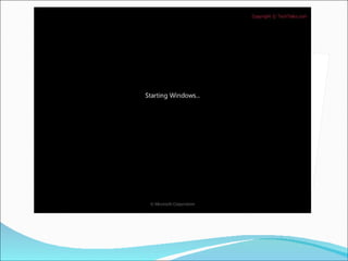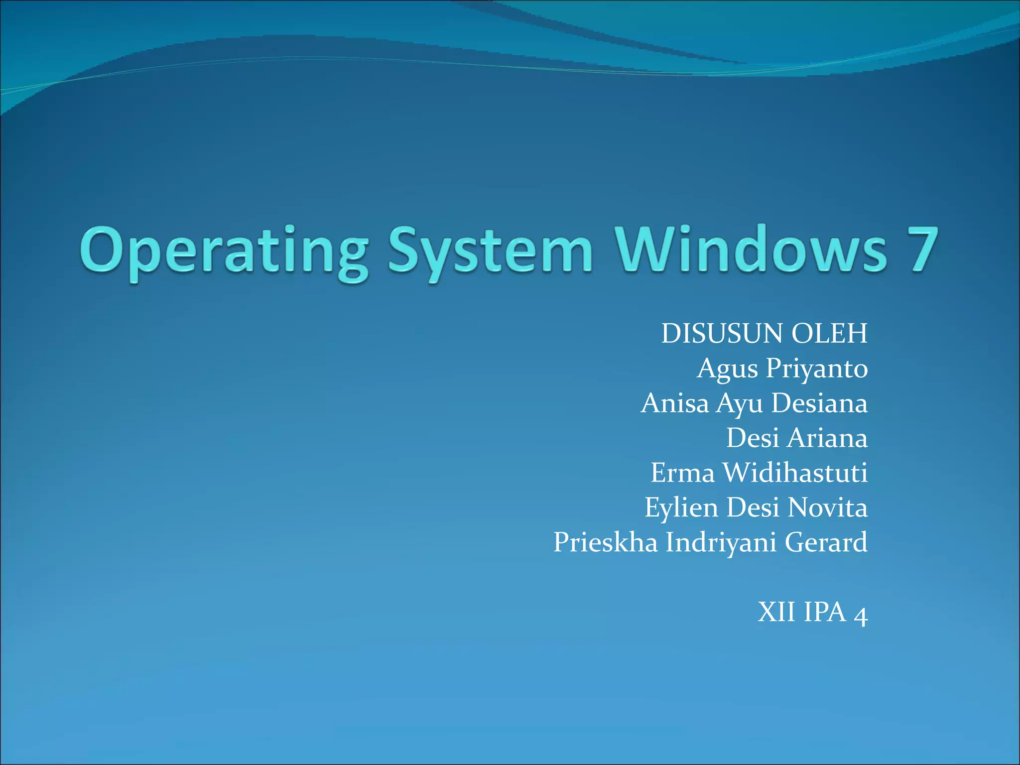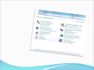 Dokumen tersebut menjelaskan tentang sistem operasi Windows 7, mulai dari pengertian sistem operasi, sejarah perkembangan Windows sejak versi 1.01 hingga Windows 7, tipe-tipe Windows 7 beserta fitur dan keterbatasannya, spesifikasi minimum untuk menginstal Windows 7, langkah-langkah instalasi, serta penjelasan singkat tentang Control Panel pada Windows 7.