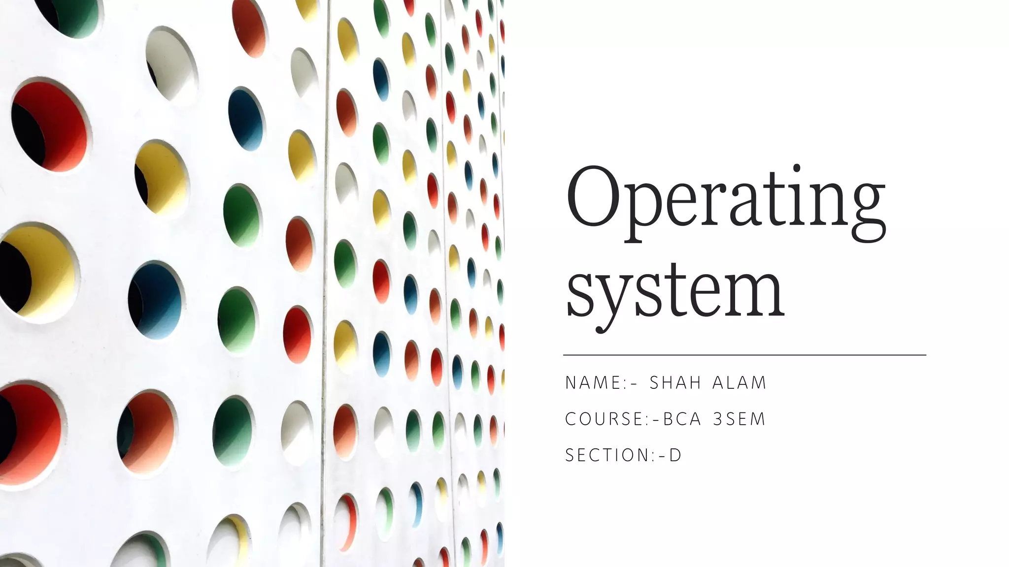The document provides an overview of operating systems, including their structure, main functions, and popular examples. It discusses how operating systems control computer resources and provide an interface between hardware and software. The main functions of an operating system include process management, memory management, file management, security, and command interpretation. Popular single-user operating systems include DOS, while multi-user systems include Unix and Windows. In conclusion, operating systems are essential for running applications and enabling work to be done on a computer.