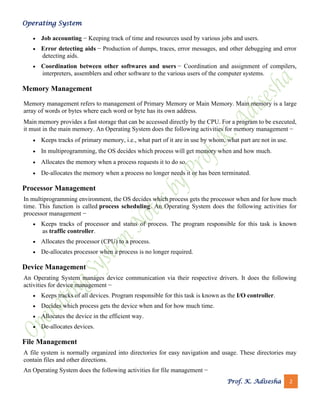 An operating system is an interface between a computer user and the computer hardware. The document discusses the key functions of operating systems including memory management, processor management, device management, file management, security, and more. It provides examples of popular operating systems like Linux, Windows, and describes different types of operating systems such as batch, time-sharing, distributed, network, and real-time operating systems.