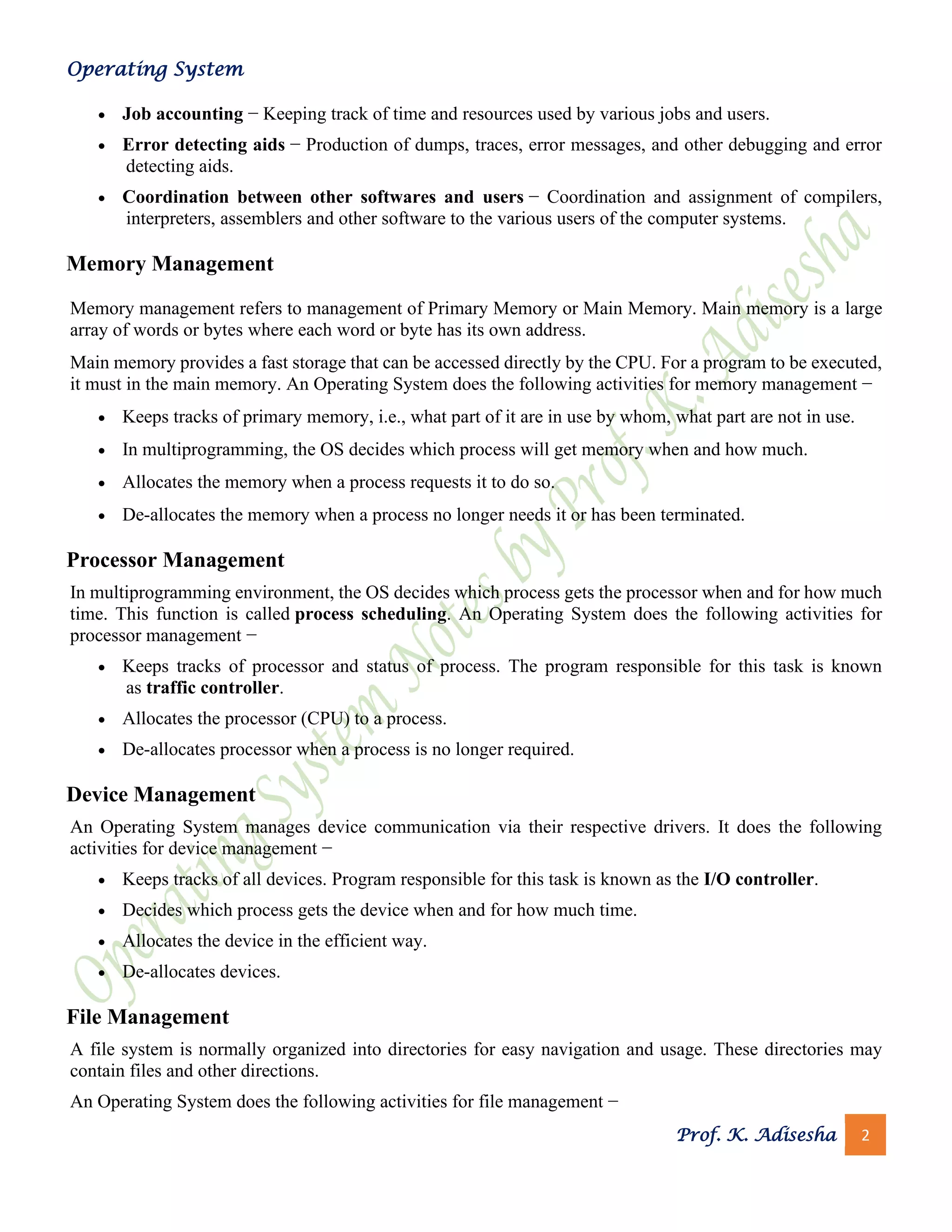 An operating system is an interface between a computer user and the computer hardware. The document discusses the key functions of operating systems including memory management, processor management, device management, file management, security, and more. It provides examples of popular operating systems like Linux, Windows, and describes different types of operating systems such as batch, time-sharing, distributed, network, and real-time operating systems.