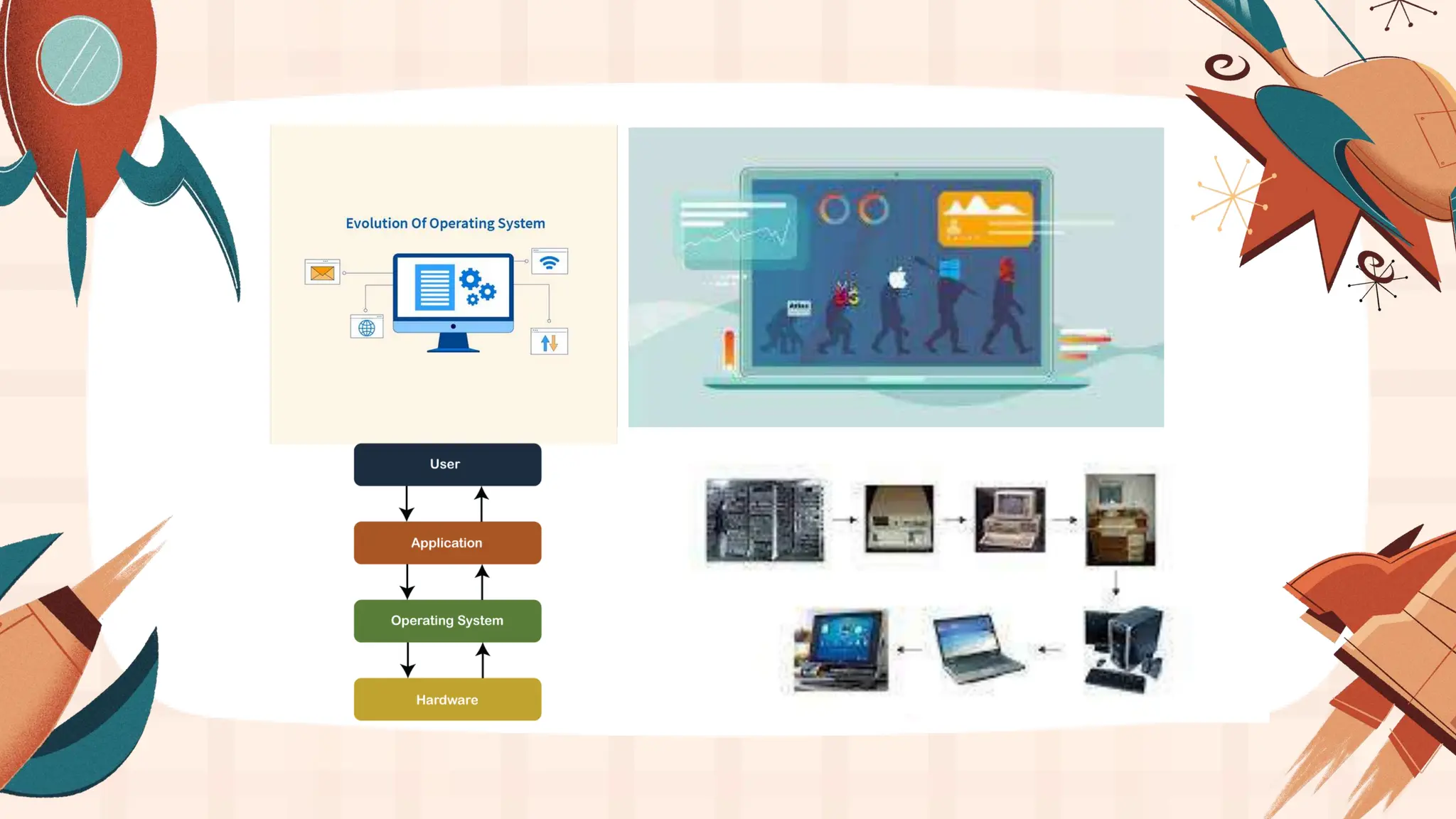 An operating system manages computer hardware resources and provides common services for programs. It performs key functions like process management, memory management, I/O device management, and a user interface. Operating systems have evolved from vacuum tube-based serial processing systems to today's personal computing systems. They have progressed from simple batch OSes to multi-programming OSes to time-sharing OSes. In conclusion, operating systems allocate resources, support applications and utilities, and control hardware while providing a user interface.