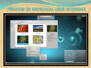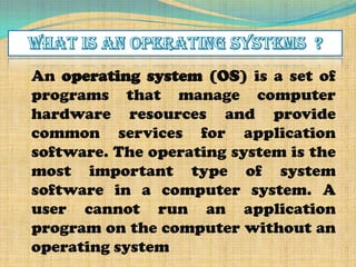 The document discusses different types of operating systems including real-time, multi-user, single-tasking vs multi-tasking operating systems. It describes the key functions of an operating system like resource management, data management, and job management. It also explains the two main types of user interfaces - command line interface and graphical user interface. Finally, it provides details about popular operating systems like UNIX, MS-DOS, Windows, and Linux.