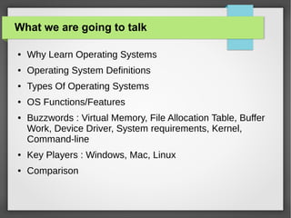 The document discusses the importance of operating systems (OS), their definitions, types, functions, and key players like Windows, Mac, and Linux. It covers various OS types such as real-time, multi-user, and embedded systems, as well as features like memory and process management. Additionally, it compares the pros and cons of major OSs, emphasizing the variations in compatibility, reliability, and user support.
