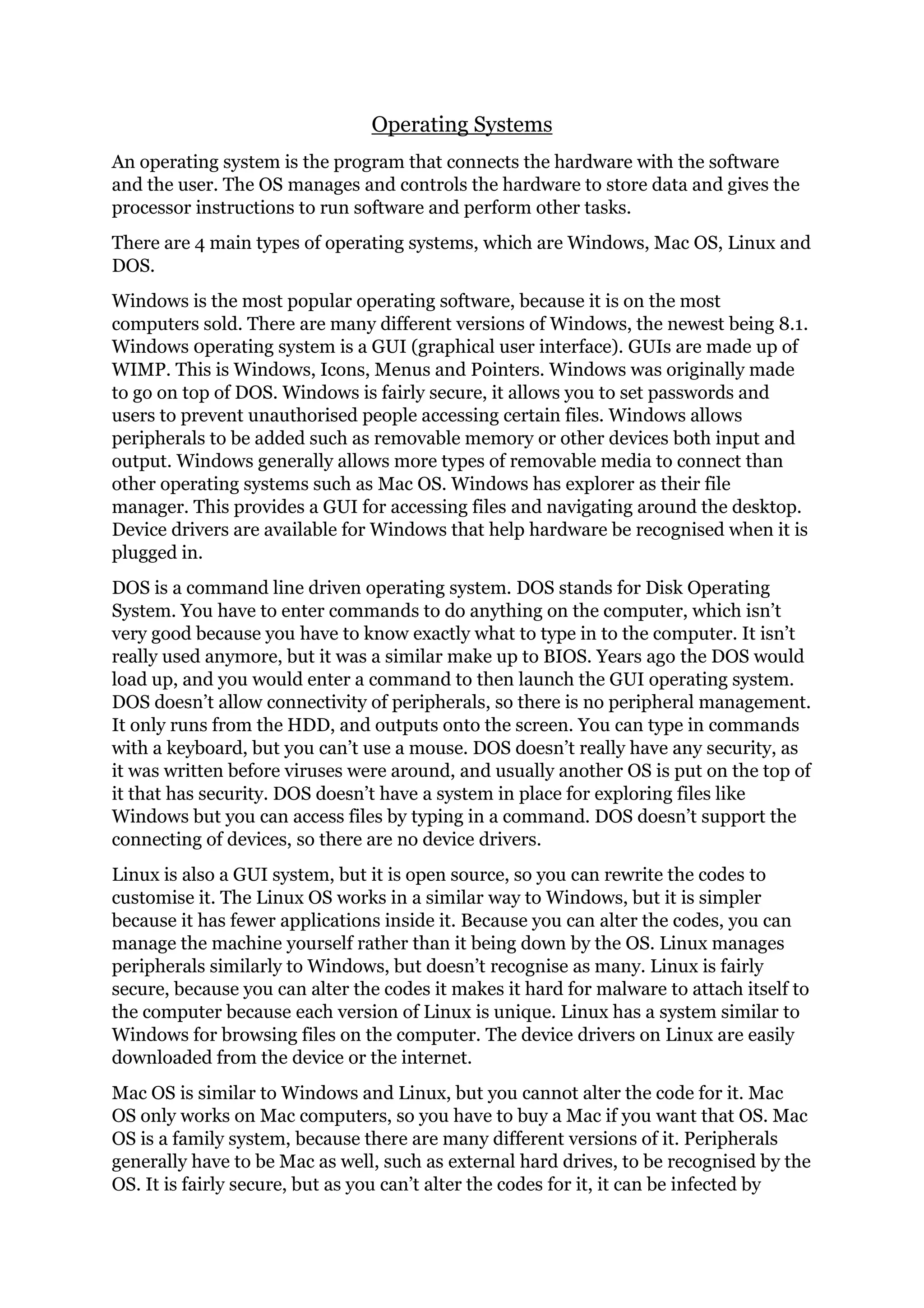 An operating system connects hardware and software, managing hardware resources and allowing the processor to run software and perform tasks. The main types are Windows, Mac OS, Linux, and DOS. Windows is the most popular as it comes preinstalled on most computers sold and has a graphical user interface (GUI) allowing interaction through windows, icons, menus and pointers. It supports many types of hardware and allows security through passwords but the code cannot be modified. Linux also has a GUI but is open source, allowing users to customize it, though it supports fewer types of hardware. Mac OS only runs on Apple computers and also has a GUI, but unlike Linux, its code cannot be modified.
