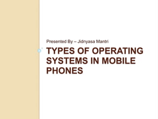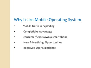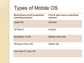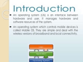 The document discusses mobile operating systems, detailing their evolution, types, advantages, disadvantages, and applications. It highlights the differences between mobile and smartphone operating systems and emphasizes the need for a balance between design, hardware, and software for optimal user experience. The future of mobile OS, including emerging platforms like Firefox OS, Tizen, and Ubuntu Touch, is also addressed, suggesting that success depends on user requirements.