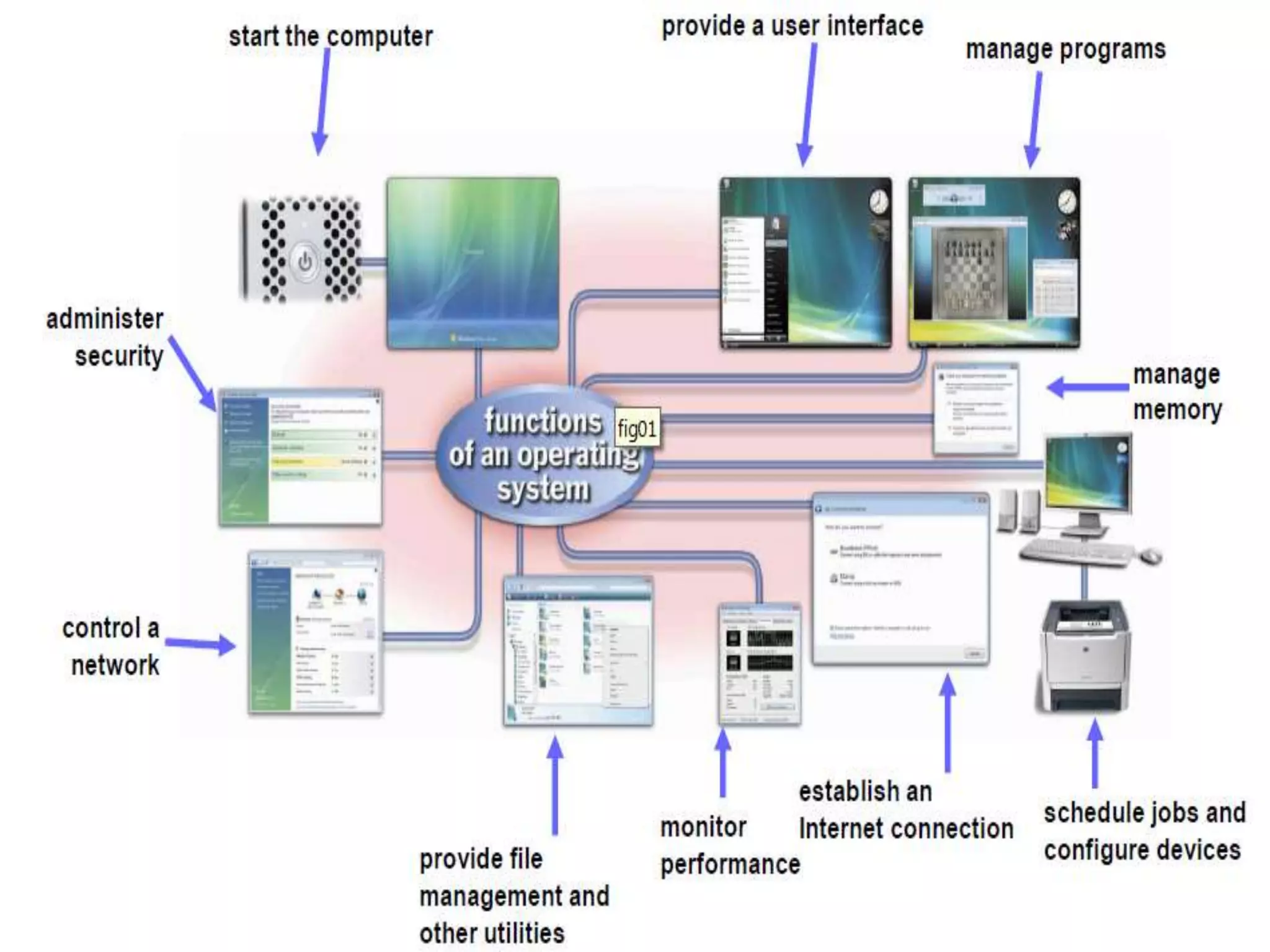 The document discusses operating systems (OS) and their core functions including processor, memory, storage, and device management. It describes various types of OS such as real-time and multi-user systems, and outlines computer communications and network components like routers and protocols. Additionally, it presents network topologies such as client-server, point-to-point, and star configurations.