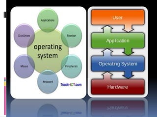 The document discusses operating systems, providing a brief history and overview of key concepts. It describes how operating systems manage computer resources and enable application programs to function. Early computers did not have operating systems, while modern operating systems evolved in complexity throughout the 1960s. The document outlines several major operating systems including UNIX, Windows, Mac OS X, Linux, Android, and iOS, and notes how operating systems will continue to rapidly evolve in the future.