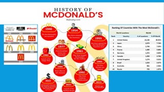 The presentation outlines McDonald's innovative supply chain strategy centered on efficiency and cost reduction, involving strategic partnerships with a limited number of suppliers to ensure consistent quality and standardized processes. It highlights logistical operations through two distribution centers, advanced inventory management, and a commitment to supporting local agriculture while addressing customer needs with tailored menu items. Key takeaways emphasize the importance of long-term relationships with suppliers, collaborative planning, and addressing changing consumer preferences to achieve growth in the competitive fast-food industry.