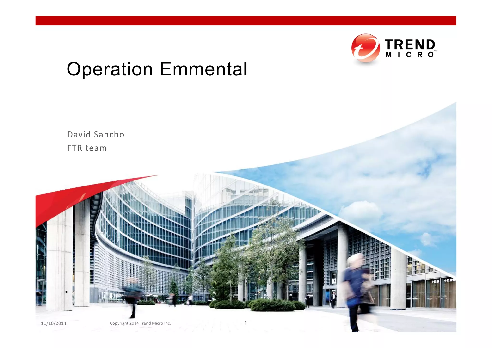 The document discusses Operation Emmental, a cybercrime operation targeting online banking in Switzerland and Austria. It describes the attacker's infrastructure, including DNS servers, command and control servers, hosting servers, and Android and Windows malware. It lists domains involved and notes they were registered by Oleg Makarov. The document examines the legitimate domains impersonated by the malware and the SSL certificate issued to the command and control server hosting banking credentials stolen by the malware.