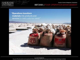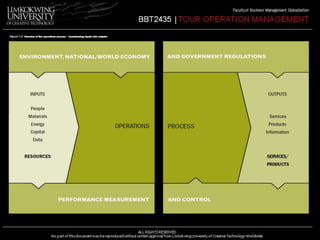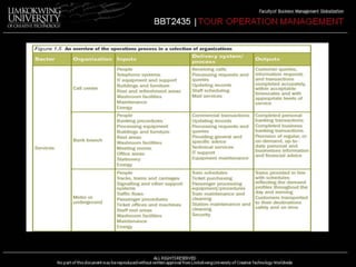 The document provides an overview of operations management. It defines operations management as managing people, materials, resources and delivery systems to transform inputs into outputs in the form of goods and services. The key tasks of operations management are to design, produce and deliver products and services to customers. Operations management plays an important role in organizational success by managing a large percentage of costs, people and assets on a daily basis while also taking a strategic role in supporting competitive priorities. The document discusses differences between manufacturing and service operations and how the role of operations management varies depending on the type of organization, complexity of processes, and nature of outputs.