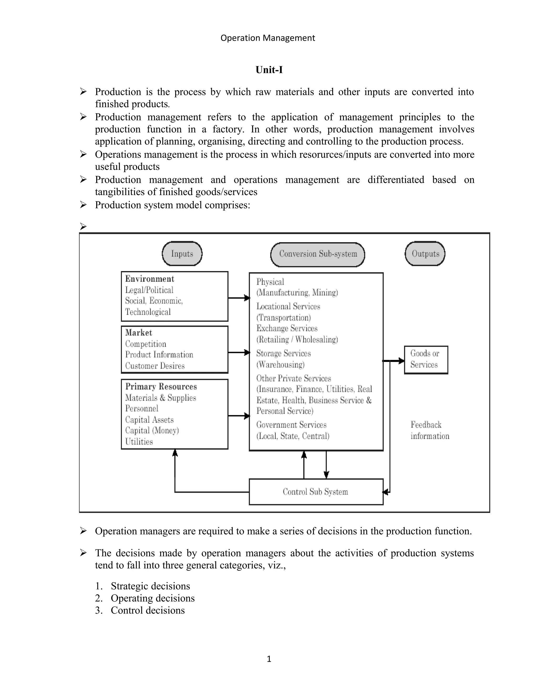The document discusses various concepts related to operations management. It defines production management and operations management, and differentiates between the two. It also describes different types of production systems such as job shop production, batch production, mass production, continuous production and intermittent production. The document further discusses concepts like master production scheduling, aggregate planning, capacity planning, demand forecasting techniques and various decisions involved in production management.