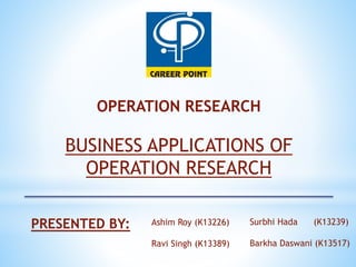 This document provides an overview of operations research (OR), including its applications in business. OR uses mathematical modeling and scientific techniques to help optimize complex decision-making problems under constraints like limited resources. It discusses common OR techniques like linear programming, transportation problems, and queuing theory. The document also outlines the typical steps to an OR study, including formulating the problem, building a mathematical model, selecting alternatives, and implementing recommendations. Finally, it lists some common areas where OR is applied, such as national planning, defense, manufacturing, and transportation.
