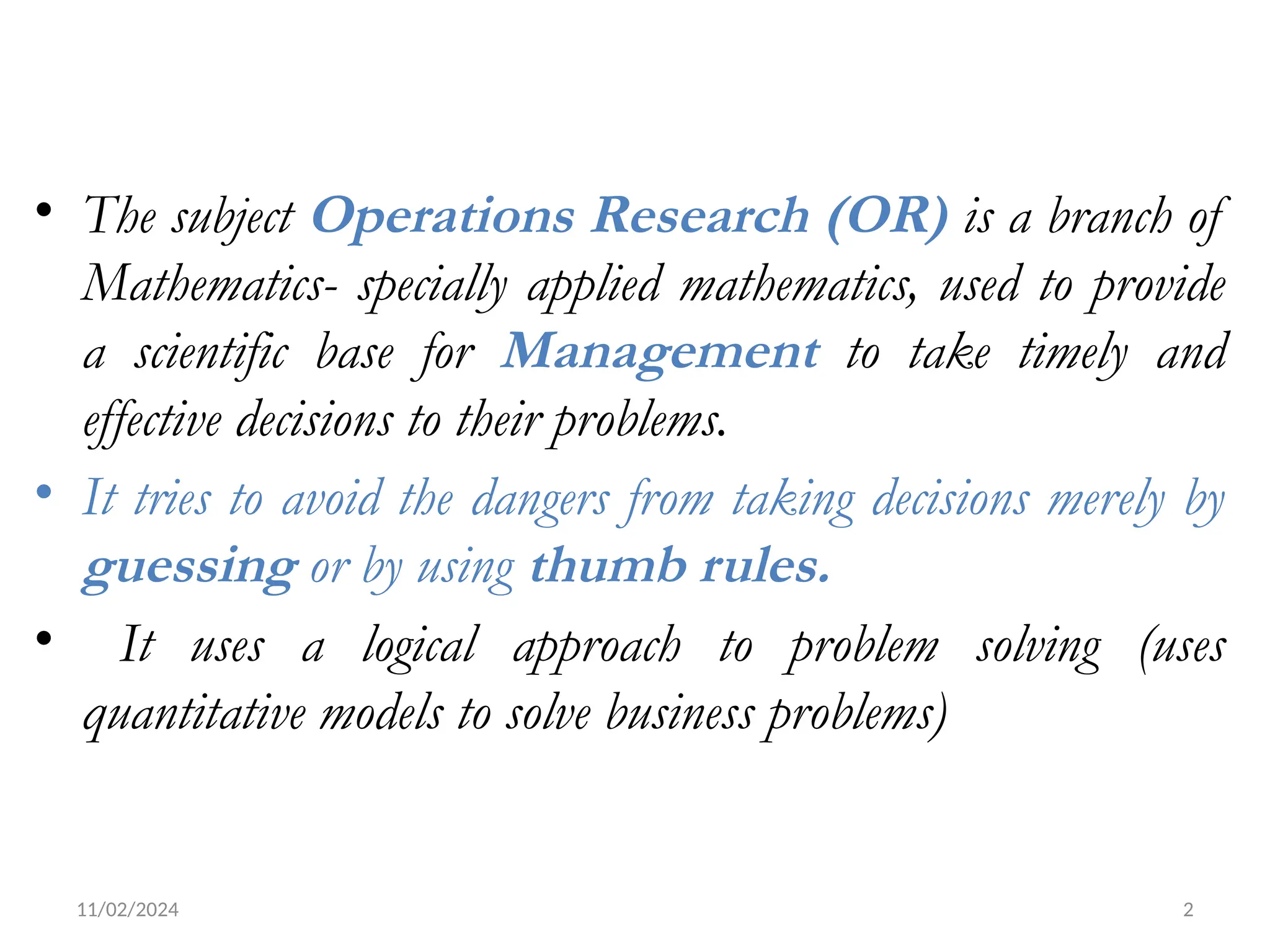 The document provides an extensive overview of operations research (OR), detailing its definition, history, significance, and applications in management decision-making. OR is characterized by a quantitative and systematic approach to problem-solving, emphasizing the use of mathematical models and interdisciplinary collaboration. It encompasses various techniques and methodologies that enhance efficiency across sectors such as finance, industry, healthcare, and agriculture.