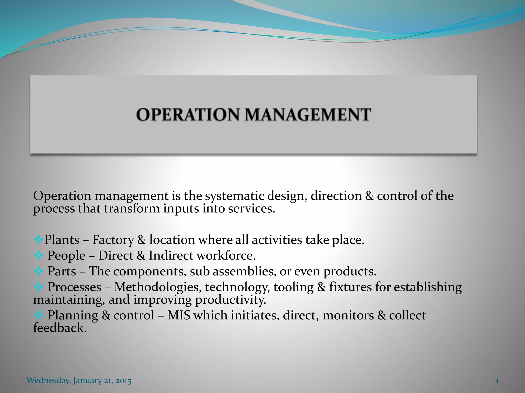 The document discusses key aspects of operation management and strategy. It defines operation management as the systematic design, direction, and control of processes that transform inputs into services. It identifies the five key components in any operation as plants, people, parts, processes, and planning/control. It then discusses elements of operation strategy including production systems, facilities, product/service design, quality, flexibility, and time. Finally, it covers topics like competitive priorities, industry best practices, manufacturing strategies, and the link between corporate, business and operation strategies.